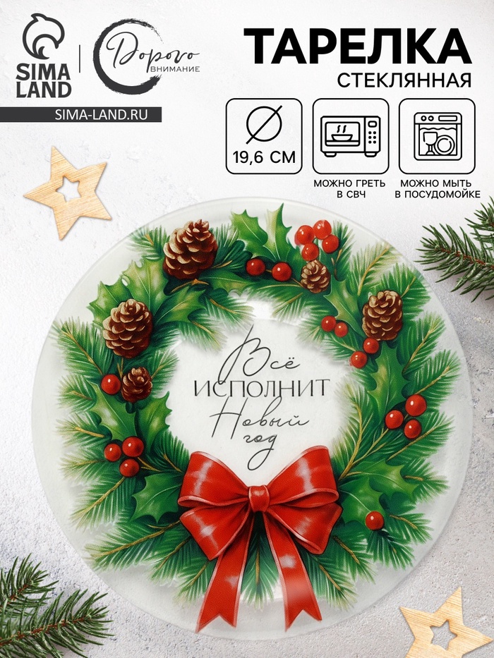 Новогодняя стеклянная тарелка «Венок на Новый год» — идеальный выбор для сервировки стола.